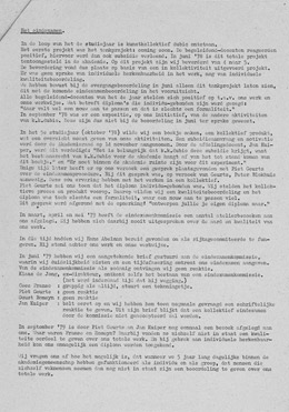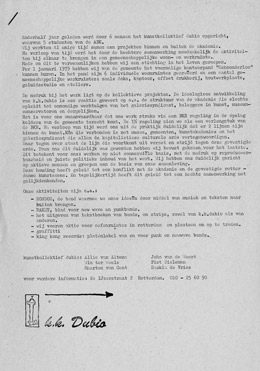 Ondertussen waren we nog altijd Kunstacademiestudenten. We zouden het bijna vergeten zijn. Het eindexamen diende zich nochtans aan. We bedongen gezamenlijk af te studeren met onze collectieve projecten. Als Kunstkollektief Dubio zogezegd. Men stemde schoorvoetend in. De procedure ging in werking. Na enige tijd, toen het moment suprème naderde, kon het toch weer niet. De diploma’s werden op naam uitgereikt, dus wilde men weten wie wat gemaakt had. We gaven niet thuis en schreven een manifest tegen de Kunstacademie als instituut en handlanger van de kunst- en galeriemaffa. Die zat.
